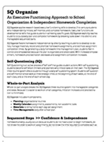 SQ Organize applies research-based executive functioning skills to develop 21st-century students who independently initiate, self-monitor, and complete homework. Executive functions are developmental skills that guide students in achieving specific goals. SQ Organize explicitly teaches students to purposely plan and complete homework by breaking tasks down into distinct and manageable sequenced parts.
